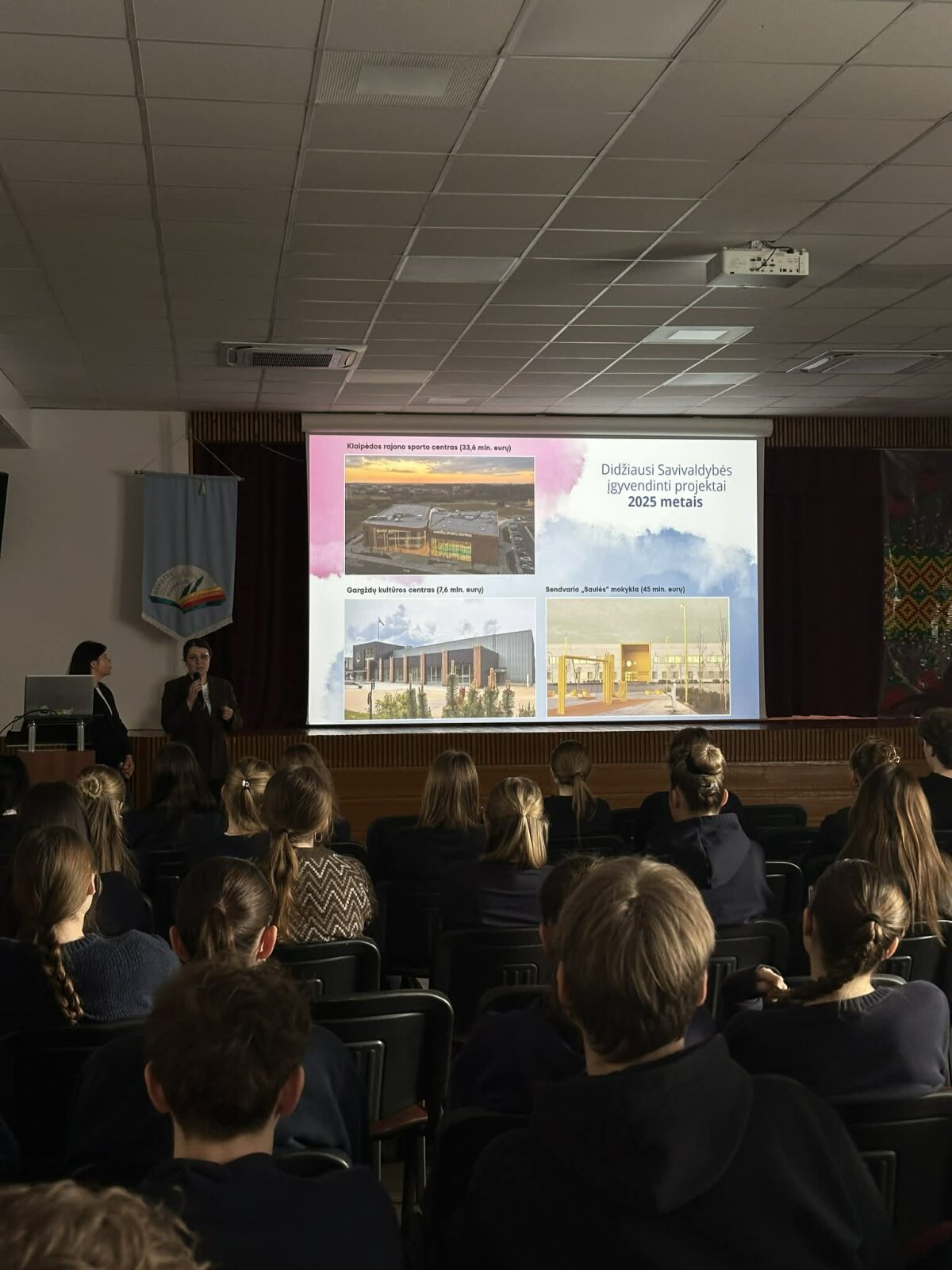 Šiandien „Vaivorykštės” gimnazijoje lankėsi Klaipėdos r. Savivaldybės administracijos Viešųjų ryšių ir bendradarbiavimo skyriaus vedėja Ernesta Badalova ir specialistė Laura Jankutė. Specialistės pristatė Klaipėdos r. įvykusius ir numatomus projektus. Taip pat pristatė Klaipėdos r. gyventojo kortelę, kuri suteikia galimybes įvairaus amžiaus žmonėms.