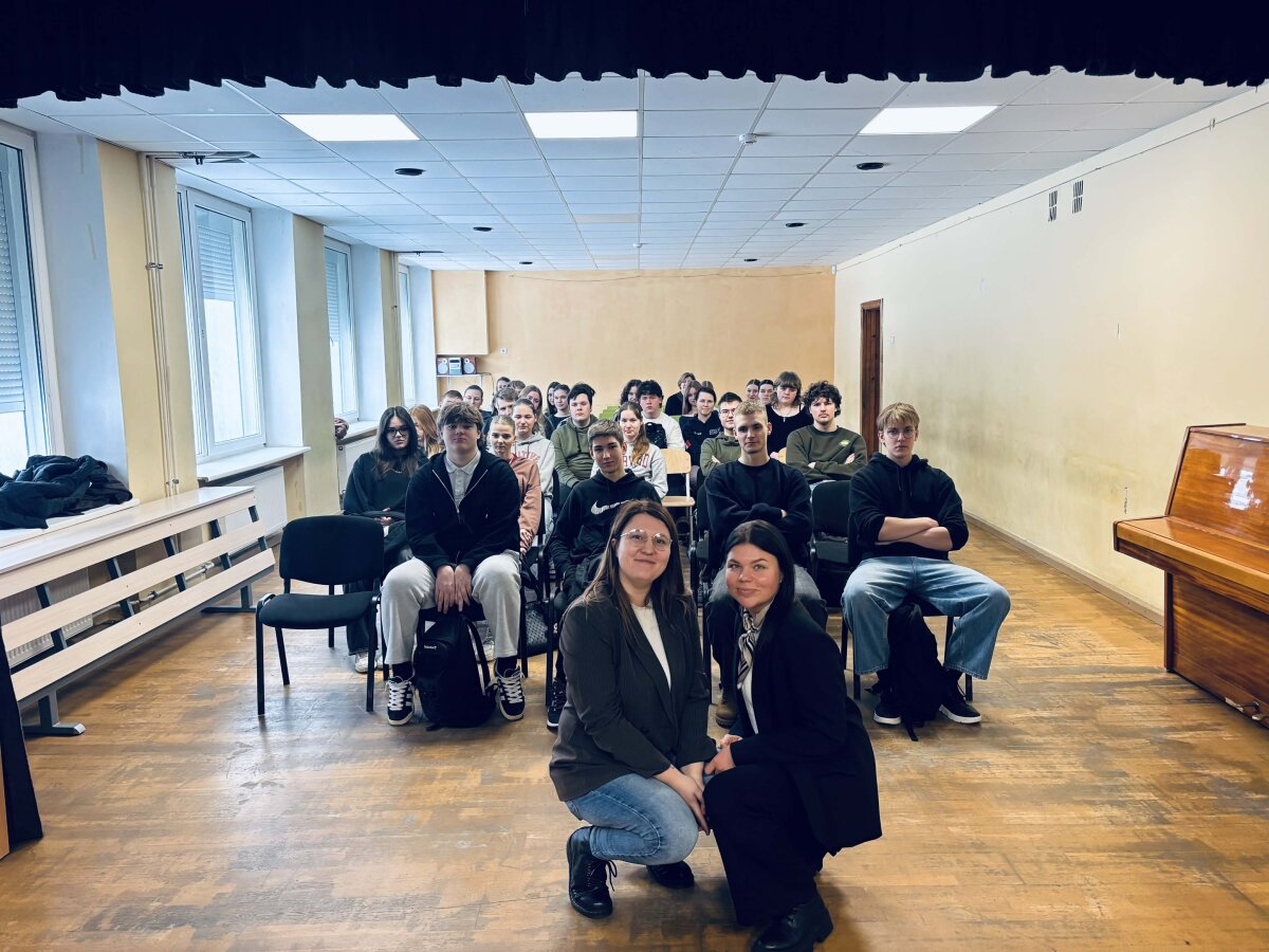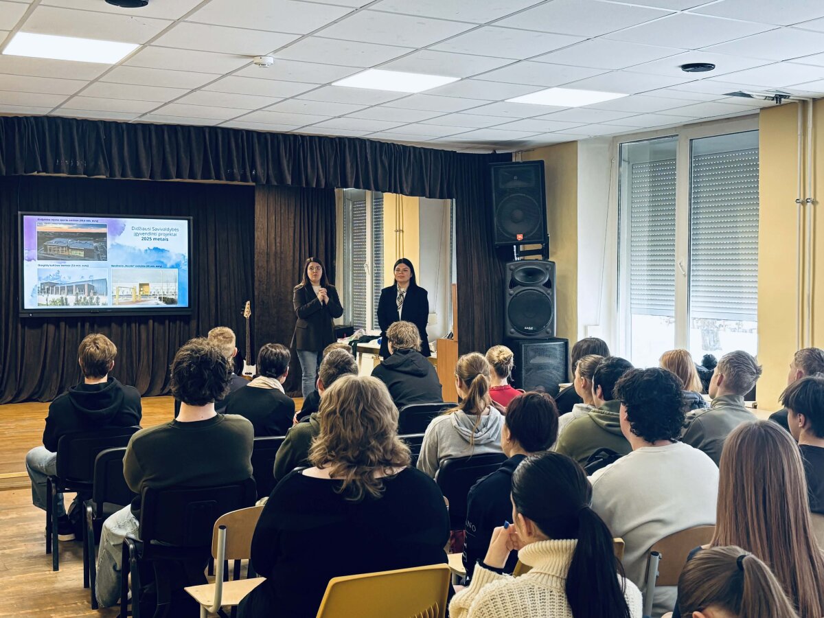 Vasario 12 d. Priekulės Ievos Simonaitytės gimnazijoje 10–11 klasių mokiniai susitiko su Klaipėdos rajono savivaldybės Viešųjų ryšių ir bendradarbiavimo skyriaus vedėja Ernesta Badalova bei specialiste Laura Jankute.
